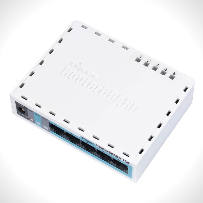 An entirely new class of product in the RouterBOARD lineup, the RB750 is a small five port ethernet router in a nice plastic case.