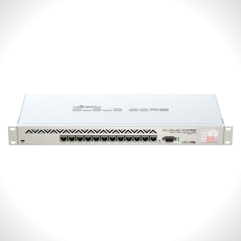 The device is available with a 1U rackmount case, has twelve Gigabit ethernet ports, a serial console cable and a USB port. The CCR1016-12G has two SODIMM slots, by default it is shipped with 2GB of RAM, but has no memory limit in RouterOS (will accept and utilize 16GB or more). It comes with power supply and 1U rackmount case.